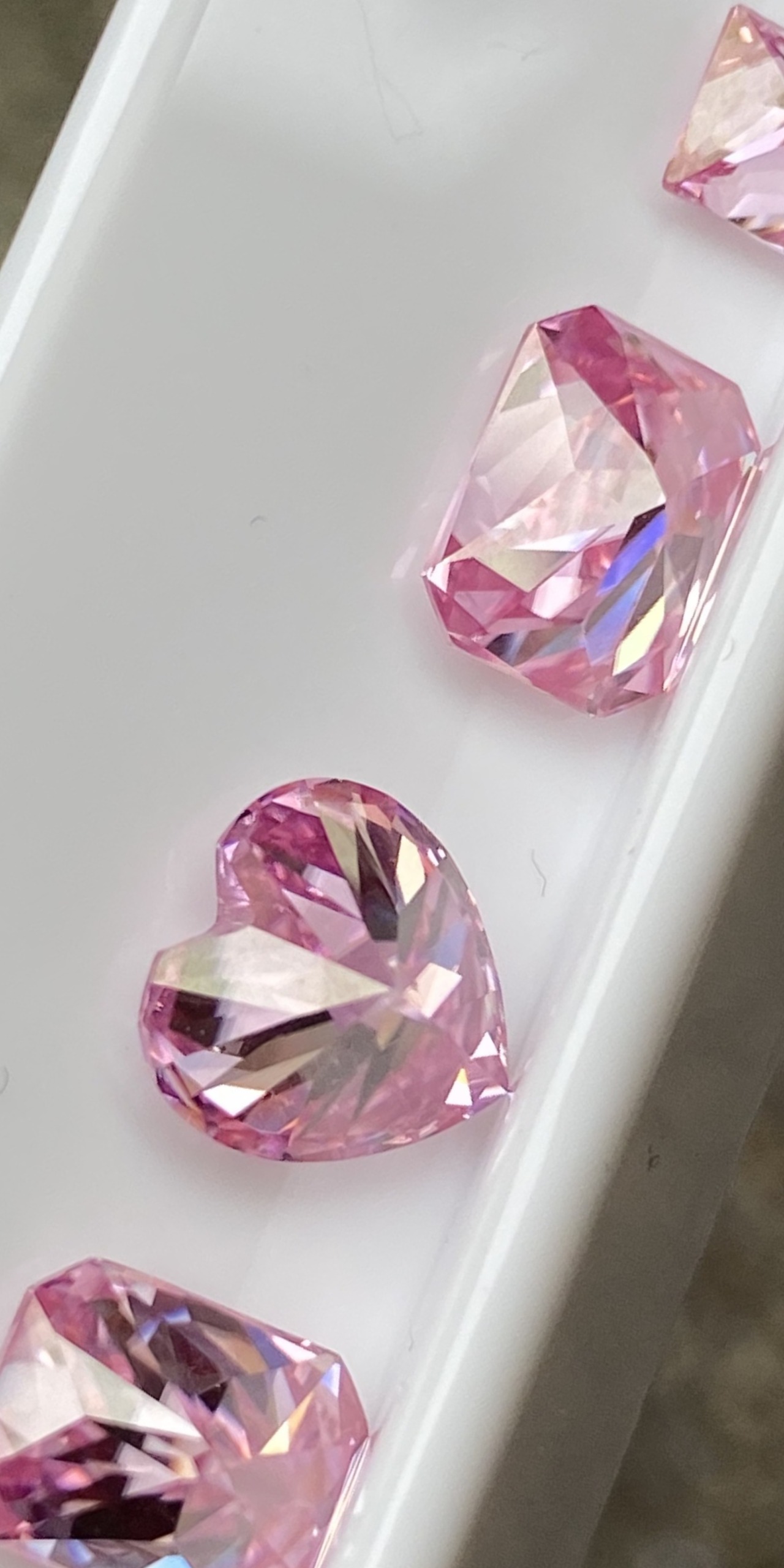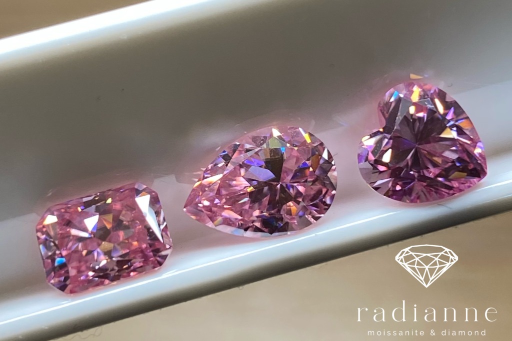ラディアンヌのピンクモアッサナイトは真空蒸着により作られており、トリートダイヤモンドの生産方法にも似ていますが、傷や摩擦にも比較的高い耐久性を持っております。
