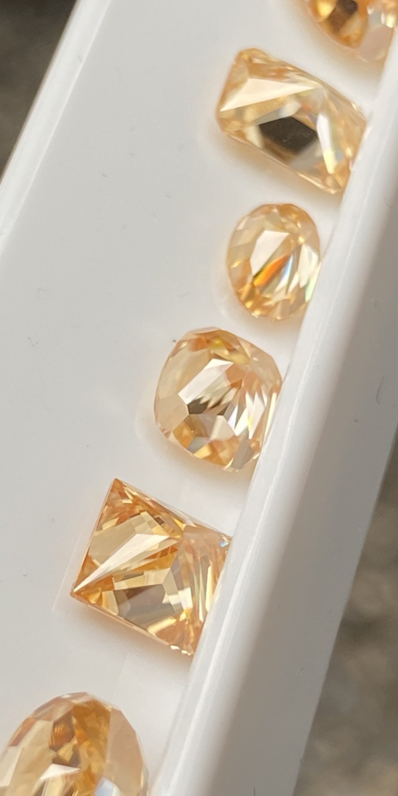 それぞれの色味で、様々なカットを揃えてみました。カットオーダーの場合この色味の範疇となりご指定が難しいものとなりますので、加工可能なルース一覧からお選びいただきジュエリーをお仕立てするのも一つの方法です。